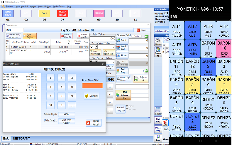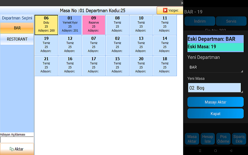 Satış ileminde Servis veya indirim gibi % ve istenen tutar girilerek yapılır ve tek ürün fiyatı değiştirilebilir.Yapılan hareketleri kullanıcı tarafından işlendiğine dair log tutulmaktadır.İptaller, Silinen Adisyonlar vb.