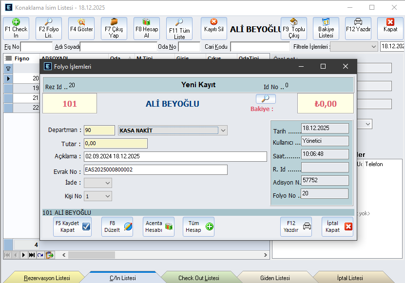 Checkout işleminde bakiye kontrolu yapıldığından bakiyesi sıfırlanmamış oda veya diğer tipteki folyolar checkout edilemez. Erken Checkoutlarda sistem kullanıcıyı uyararak hatayı önler.