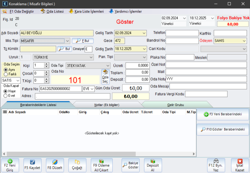 Konaklama Faturaları veya Manuel olarak fatura kesilebilir. Fatura kalemlerinde bir sınırlama yoktur.Yapılan tahsilatlar ilgili kasa hesaplara işlenir.